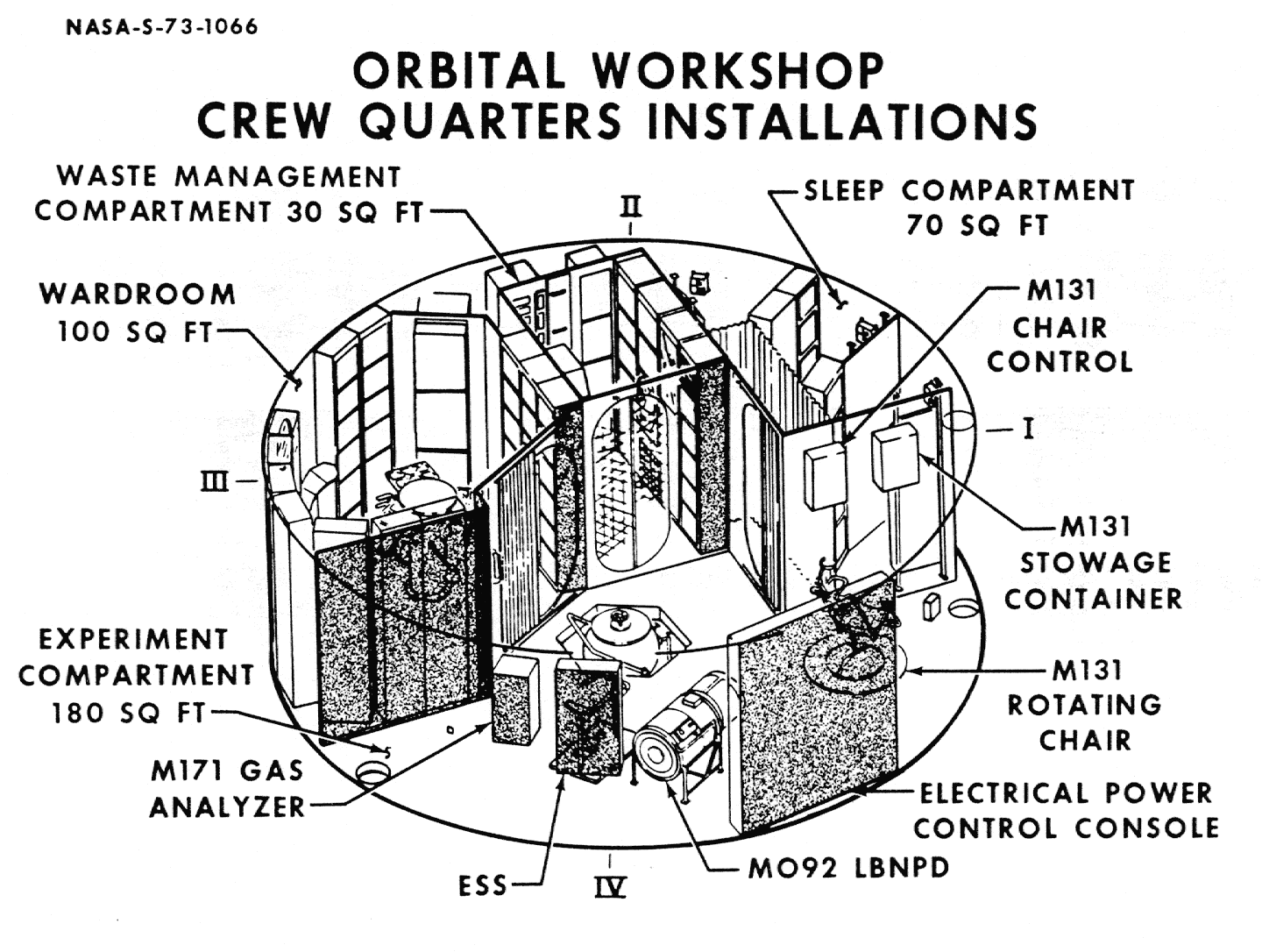 – Orbital Workshop (OWS): The core, converted from the S-IVB hydrogen tank, provided 10,426 cubic feet (295 cubic meters) of habitable volume—comparable to a large house. Divided into two floors: the lower for experiments, sleeping, and waste management; the upper for food storage, hygiene, and additional work areas.