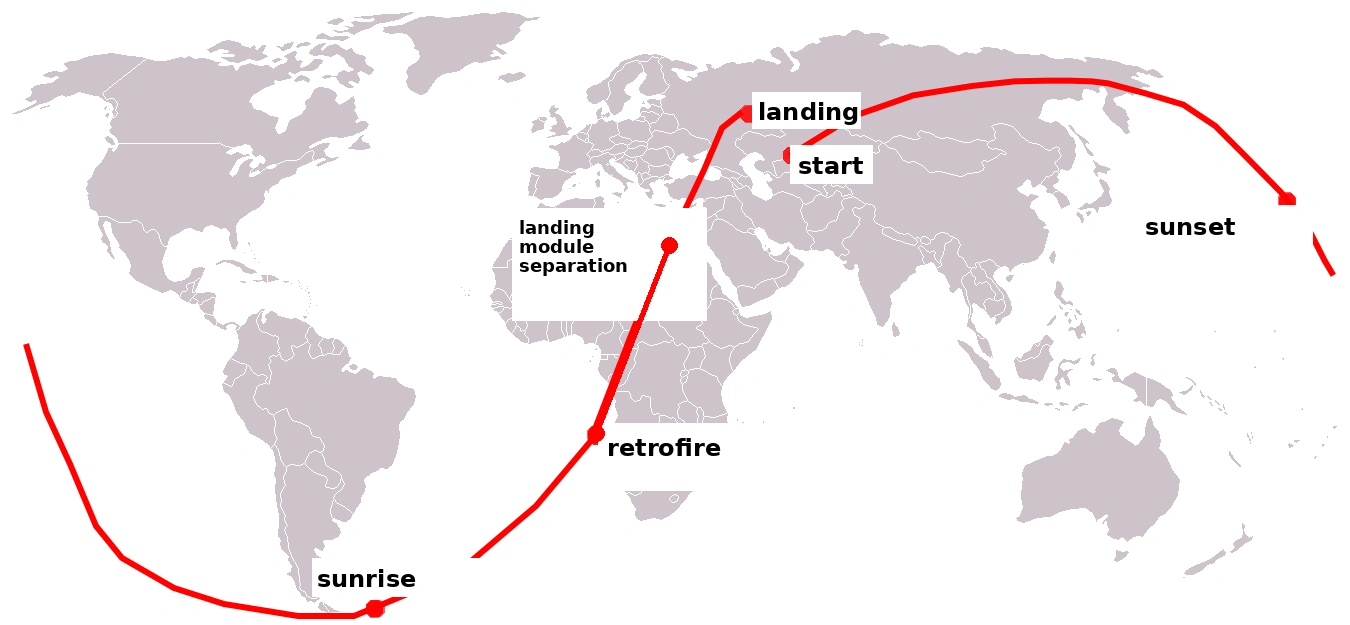 | Orbit insertion | Vostok 1 reaches orbit, the spacecraft is now falling around Earth instead of falling back down. | Being in orbit is what made it the first true human orbital mission. |